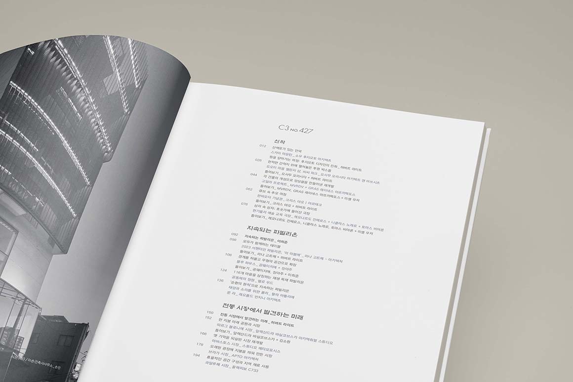 C3의 2023년 다섯 번째 호에서는 환경적 측면은 물론, 경제와 사회, 문화와 건축이 포함된 총체적인 시각에서 파빌리온의 지속 가능성을 살펴보는 ‘지속되는 파빌리온’ 특집과, 상업적 기능과 사회적 기능, 나아가 지역 특색까지 갖춘 시장을 모은 ‘전통 시장에서 발견하는 미래’ 특집, 그리고 일본과 중국, 스페인과 칠레에 완공된 다섯 개의 신작을 소개합니다.